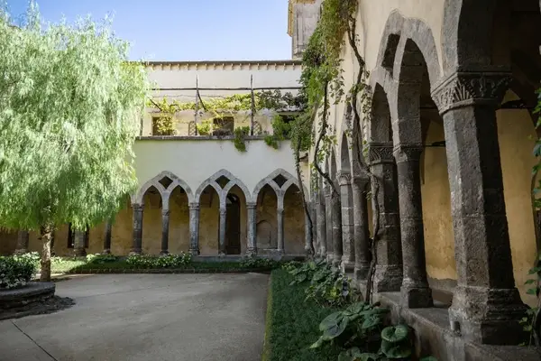 L’elemento più iconico del chiostro è l’enorme pianta di glicine che avvolge le colonne. In primavera (aprile/maggio), il soffitto del chiostro si trasforma in una cascata di fiori lilla profumatissimi. È senza dubbio uno dei posti più fotogenici di tutta la Penisola Sorrentina.